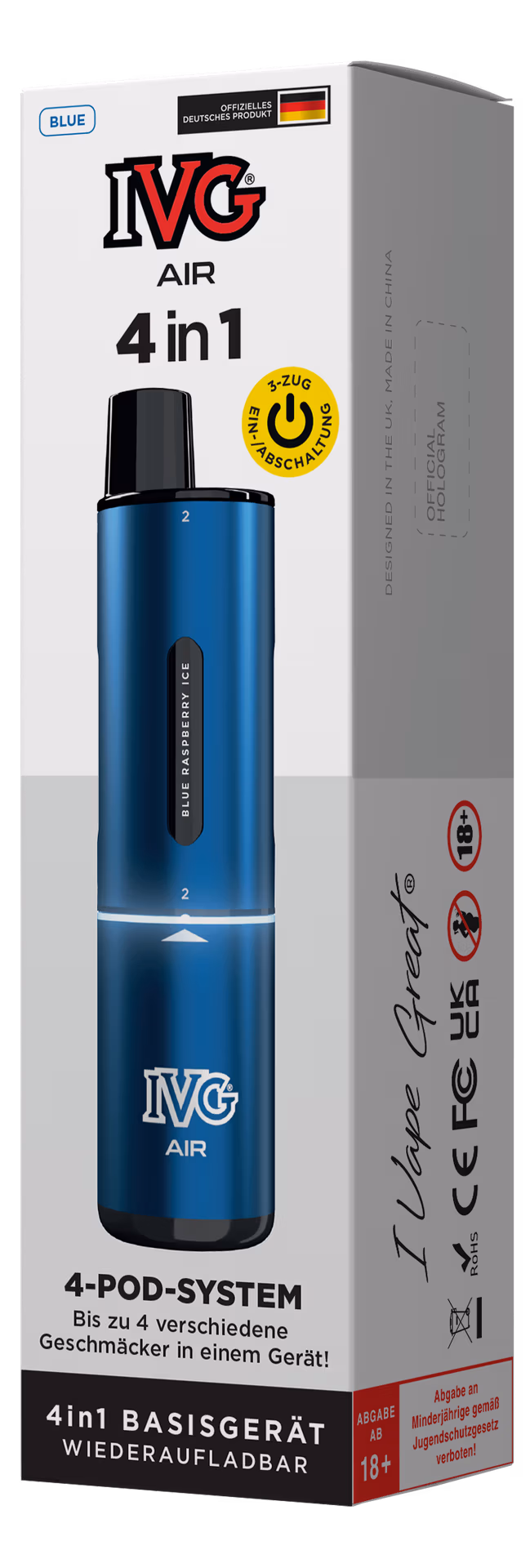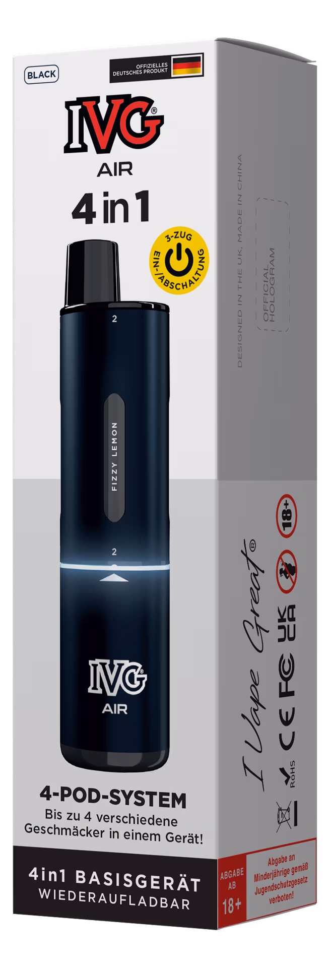 Das IVG Air 4 in 1 Basisgerät bietet dir die Freiheit, bis zu vier verschiedene IVG Air Pods gleichzeitig zu nutzen. Mit dem praktischen Drehmechanismus wechselst du den Geschmack ganz einfach – ohne lästiges Umstecken. Kompakt, leistungsstark und perfekt für alle, die keine Kompromisse machen wollen.